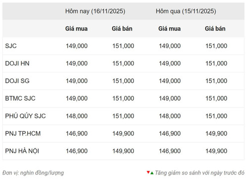 Cụ thể, tại thời điểm 19 giờ 30 phút ngày 16/11, Công ty Vàng bạc đá quý Sài Gòn (SJC) niêm yết giá vàng miếng SJC mua vào-bán ra ở mức 149-151 triệu đồng/lượng. Chênh lệch mua-bán 2 triệu đồng/lượng.