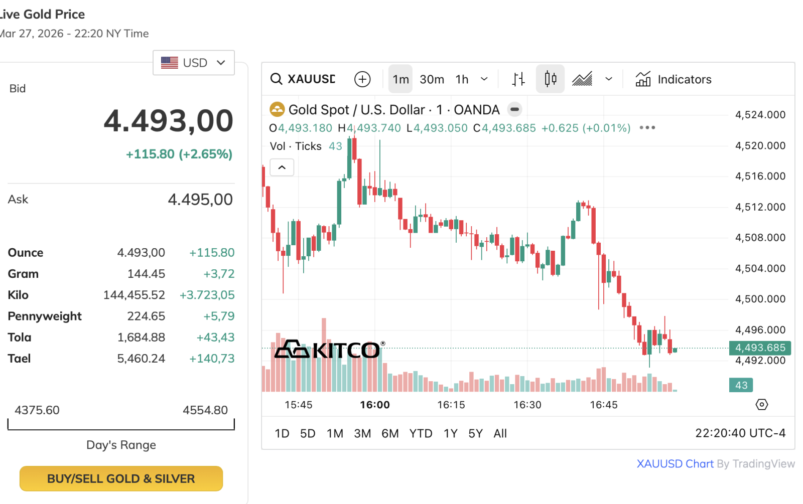 Diễn biến giá vàng giao ngay trong phiên sáng ngày 31/3 (giờ New York). Ảnh chụp màn hình: Kitco