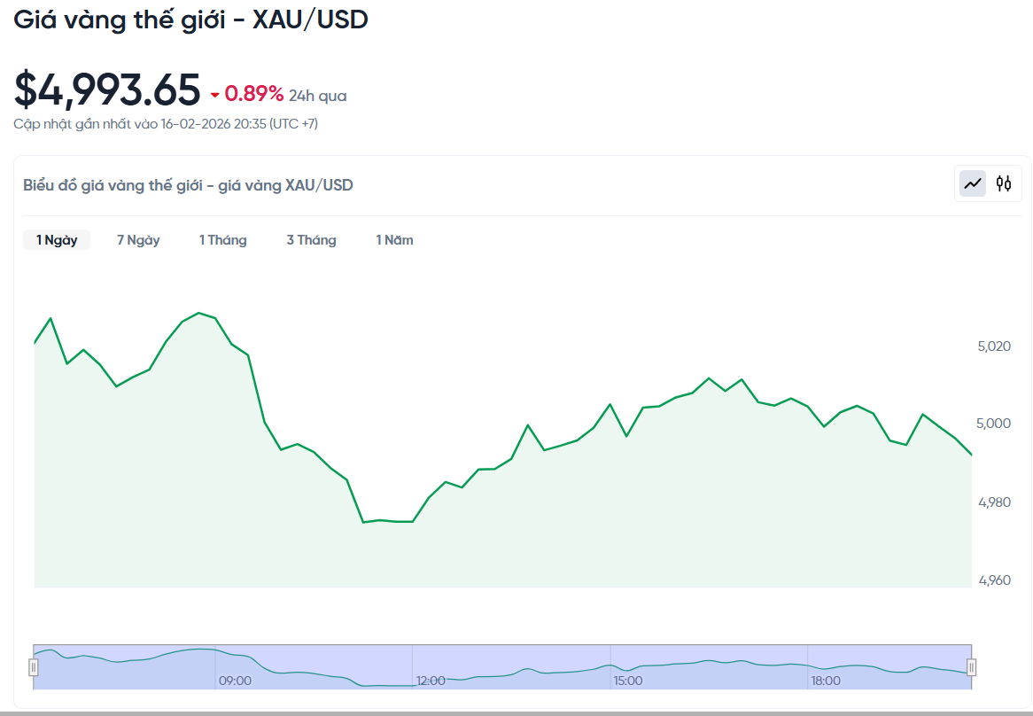Tính đến 4h00 ngày 17/02/2026 (giờ Việt Nam), giá vàng giao ngay trên thị trường quốc tế đạt 4.993,65 USD/ounce, giảm 44,87 USD/ounce so với cùng giờ hôm qua. Quy đổi theo tỷ giá tại Vietcombank (26.160 VND/USD), giá vàng thế giới tương đương khoảng 157,48 triệu đồng/lượng (chưa tính thuế, phí). Vàng miếng SJC trong nước cao hơn giá vàng thế giới khoảng 23,52 triệu đồng/lượng.