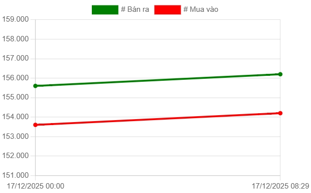 Giá vàng hôm nay, chốt phiên giao dịch ngày 17/12, Công ty VBĐQ Sài Gòn SJC niêm yết giá vàng mua vào ở mức 154,2 triệu đồng/lượng; giá bán là 156,2 triệu đồng/lượng. Chênh lệch giá mua – bán vàng SJC ở mức 2 triệu đồng/lượng.
