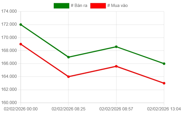 Phiên giao dịch chiều ngày 2/2, Công ty VBĐQ Sài Gòn SJC niêm yết giá vàng mua vào ở mức 163 triệu đồng/lượng; giá bán là 166 triệu đồng/lượng (giảm 2,6 triệu đồng/lượng so với phiên mua – bán giao dịch lúc sáng). Chênh lệch giá mua – bán vàng SJC ở mức 3 triệu đồng/lượng.