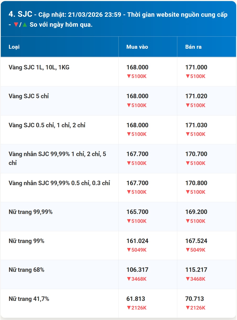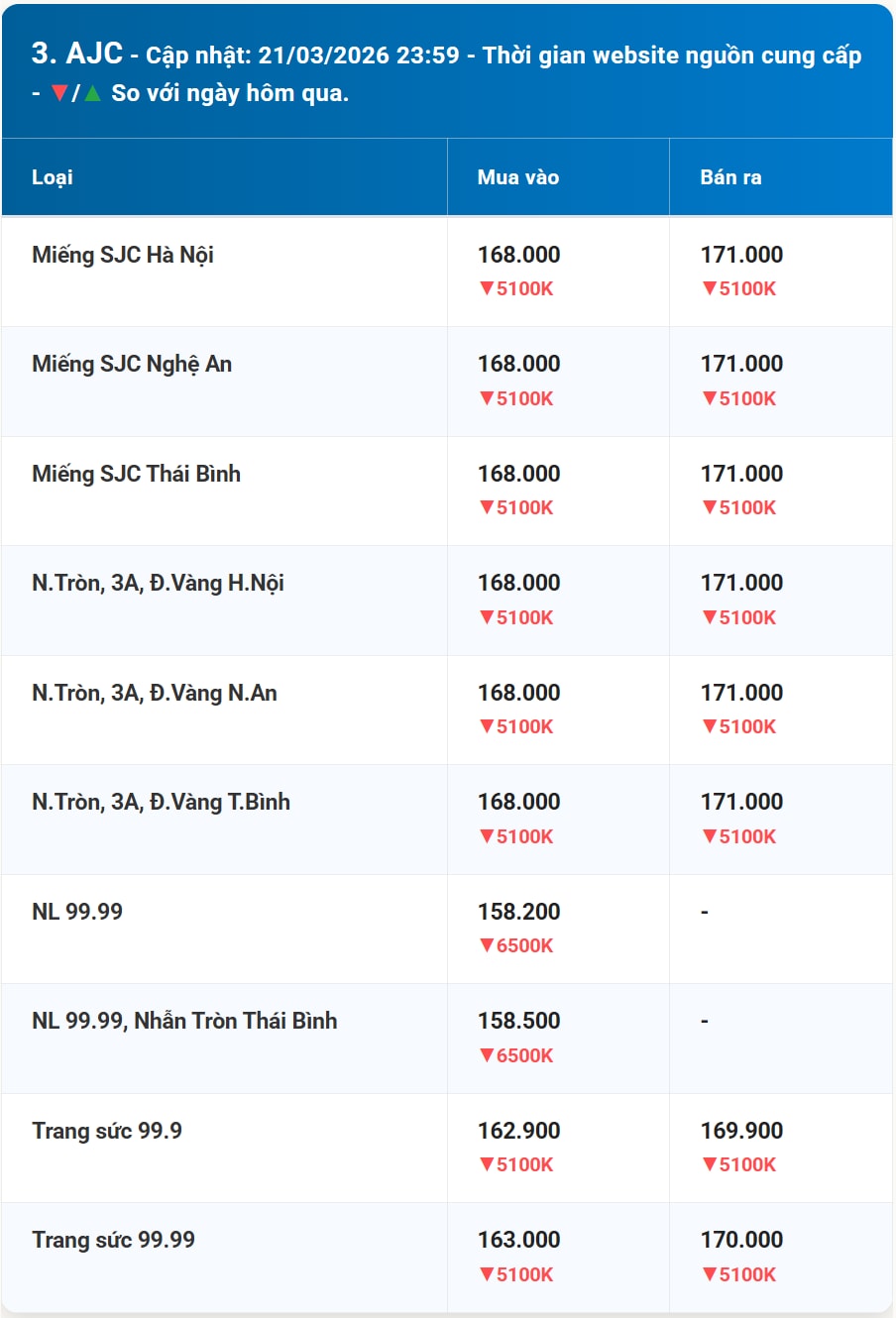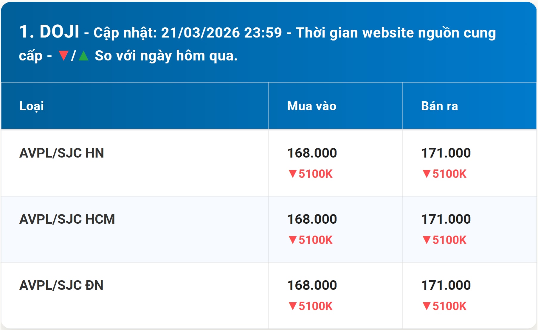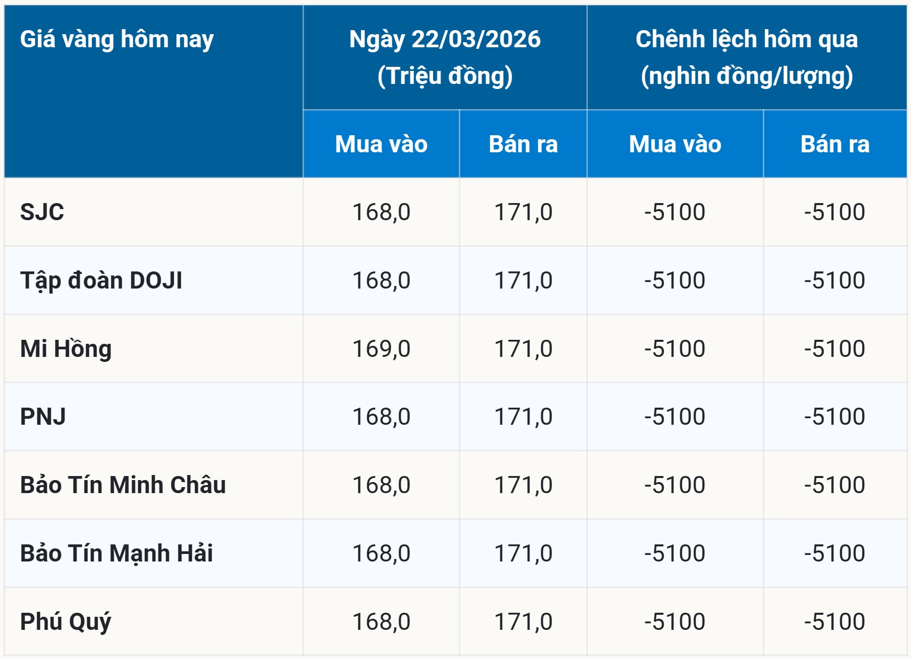 Tại SJC, giá vàng hôm nay 22/3/2026 được niêm yết ở mức 168,0 triệu đồng/lượng mua vào và 171,0 triệu đồng/lượng bán ra. So với đầu tháng 3 khi giá mua vào đạt 184 triệu đồng/lượng, giá vàng miếng đã giảm khoảng 16 triệu đồng/lượng.