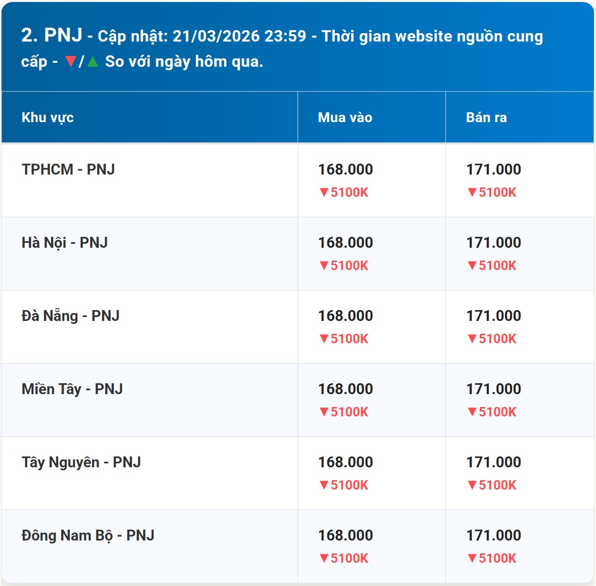 PNJ hiện niêm yết vàng miếng SJC ở mức 168,0 – 171,0 triệu đồng/lượng. So với đầu tháng 3 ở ngưỡng 184 – 187 triệu đồng/lượng, người mua đang lỗ khoảng 16 triệu đồng/lượng.