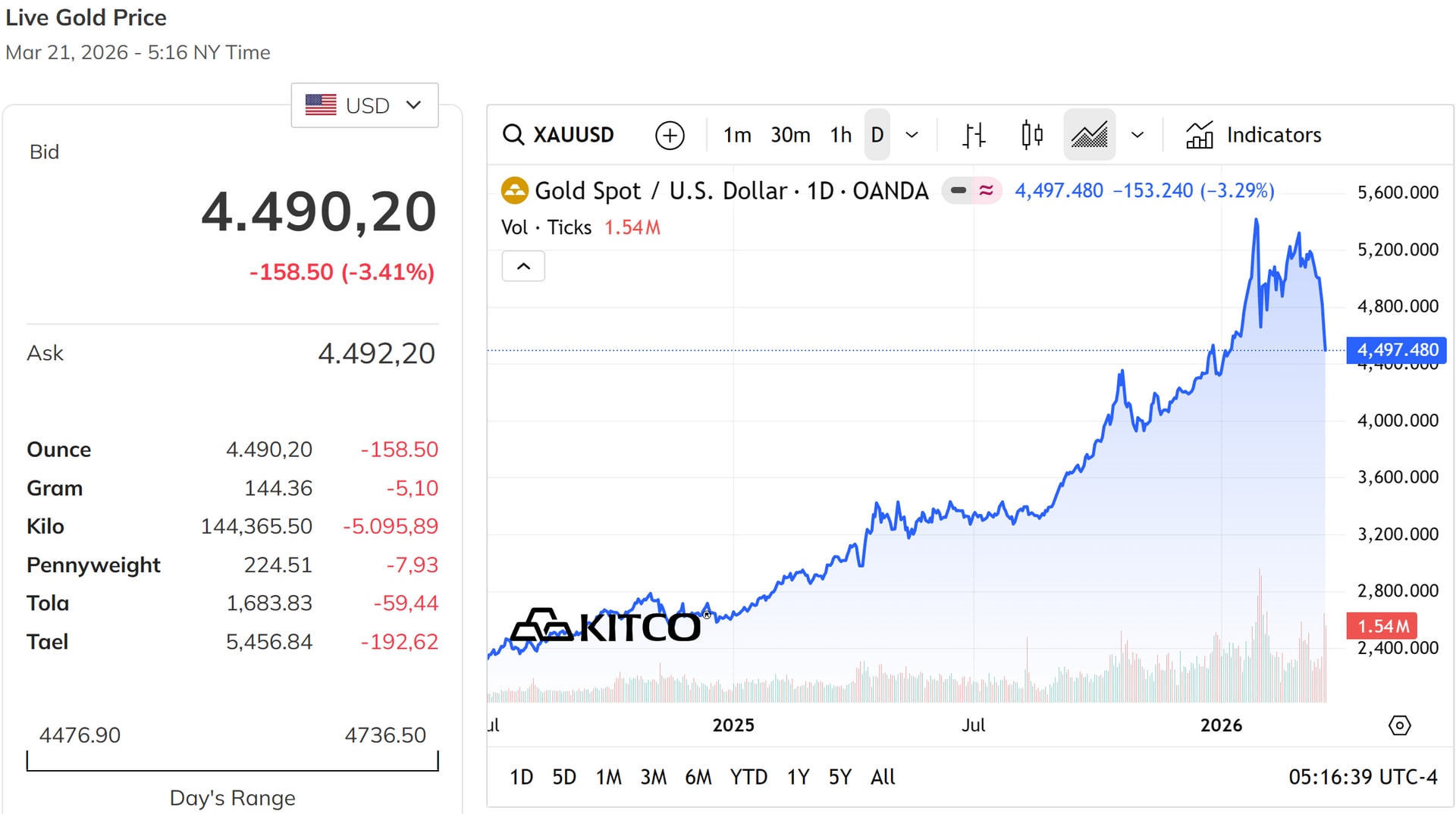 Giá vàng thế giới hôm nay 22/3/2026 chốt phiên cuối tuần ở mức 4.490,2 USD/ounce