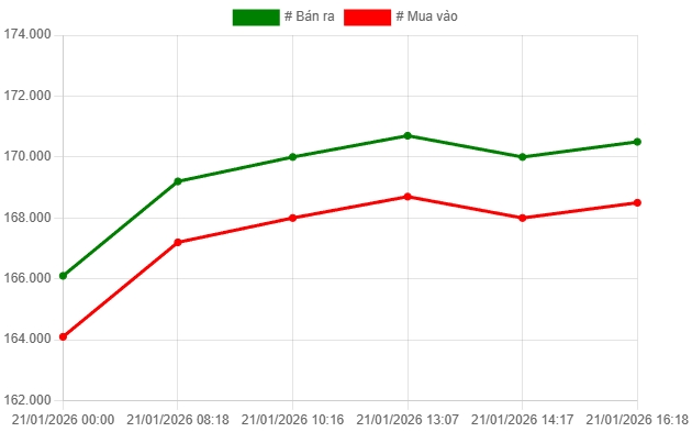 Phiên giao dịch chiều tối 21/1, Công ty VBĐQ Sài Gòn SJC niêm yết giá vàng mua vào ở mức 168,5 triệu đồng/lượng; giá bán là 170,5 triệu đồng/lượng (tăng 1,3 triệu đồng/lượng so với phiên mua – bán trước đó). Chênh lệch giá mua – bán vàng SJC ở mức 2 triệu đồng/lượng.