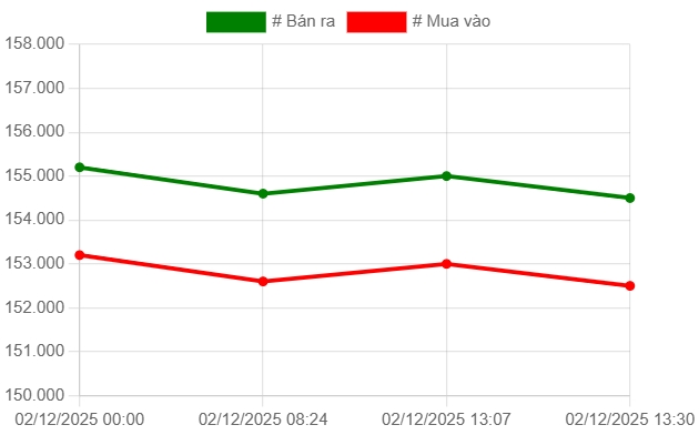 Giá vàng hôm nay, phiên giao dịch chiều tối 2/12, Công ty VBĐQ Sài Gòn SJC niêm yết giá vàng mua vào ở mức 152,5 triệu đồng/lượng; giá bán là 154,5 triệu đồng/lượng (giảm 100.000 đồng/lượng mua - bán so với phiên sáng cùng ngày). Chênh lệch giá mua – bán vàng SJC ở mức 2 triệu đồng/lượng.