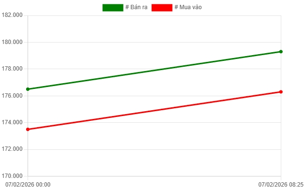 Chốt phiên giao dịch chiều 7/2, Công ty VBĐQ Sài Gòn SJC niêm yết giá vàng mua vào ở mức 176,3 triệu đồng/lượng; giá bán là 179,3 triệu đồng/lượng. Chênh lệch giá mua – bán vàng SJC ở mức 3 triệu đồng/lượng.