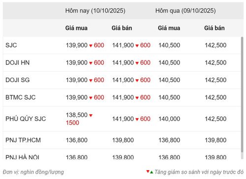 Cụ thể, tại thời điểm 10 giờ 30 phút ngày 10/10, Công ty Vàng bạc đá quý Sài Gòn (SJC) niêm yết giá vàng miếng SJC mua vào-bán ra ở mức 139,9-141,9 triệu đồng/lượng, giảm 600.000 đồng so kết phiên trước đó. Chênh lệch mua-bán 2 triệu đồng/lượng.