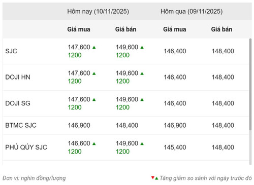 Cụ thể, tại thời điểm 8 giờ 40 phút ngày 10/11, Công ty Vàng bạc đá quý Sài Gòn (SJC) niêm yết giá vàng miếng SJC mua vào-bán ra ở mức 147,6-149,6 triệu đồng/lượng, tăng 1,2 triệu đồng so chốt phiên trước đó. Chênh lệch mua-bán 2 triệu đồng/lượng.