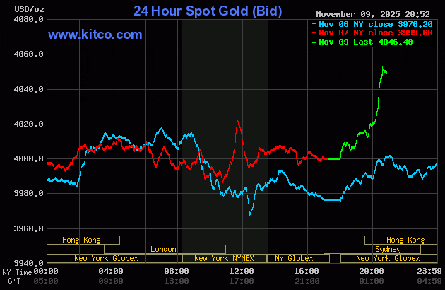 Tính đến 8 giờ 30 phút sáng 10/11 (giờ Việt Nam), giá vàng thế giới tăng 46,8 USD so chốt phiên trước đó lên mức 4.046,8 USD/ounce.