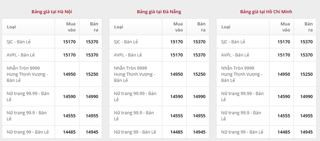 Giá vàng tại Công ty Cổ phần Đầu tư vàng Phú Quý:
