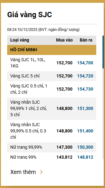 Sáng 10/12, Công ty Vàng bạc đá quý Sài Gòn SJC niêm yết giá vàng miếng ở mức 152,7-154,7 triệu đồng/lượng (mua vào-bán ra).