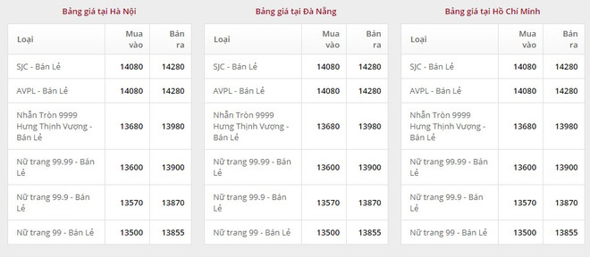 Giá vàng tại Công ty Trách nhiệm hữu hạn Một thành viên Vàng bạc Đá quý Sài Gòn (SJC):