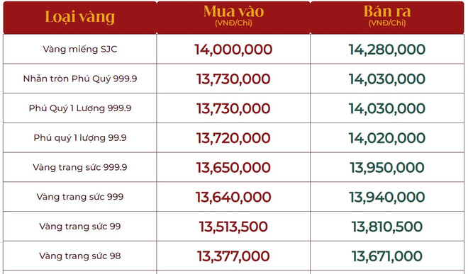 Giá vàng tại Công ty Cổ phần Đầu tư vàng Phú Quý: