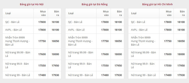 Giá vàng tại Công ty Trách nhiệm hữu hạn Một thành viên Vàng bạc đá quý Sài Gòn (SJC):