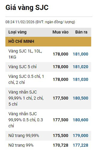 Tại Việt Nam, đầu giờ sáng 11/2, Công ty Vàng bạc đá quý Sài Gòn niêm yết giá vàng SJC ở mức 178-181 triệu đồng/lượng (mua vào-bán ra).