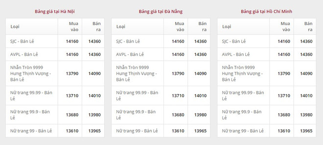 Dưới đây là bảng giá vàng tại một số công ty vàng bạc đá quý trong nước sáng 13/10: