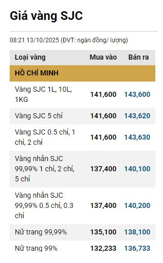 Tại Việt Nam, sáng 13/10, Công ty Vàng bạc đá quý Sài Gòn niêm yết giá vàng SJC tại thị trường Hà Nội ở mức 140,8-142,8 triệu đồng/lượng (mua vào-bán ra).