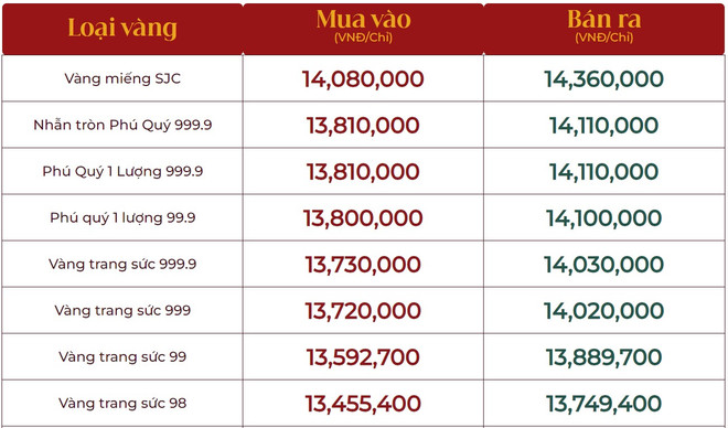 Giá vàng tại Công ty Cổ phần Đầu tư vàng Phú Quý:
