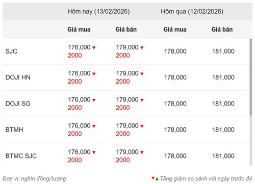 Cụ thể, tại thời điểm 17 giờ ngày 13/2, Công ty Vàng bạc đá quý Sài Gòn (SJC) niêm yết giá vàng miếng SJC mua vào-bán ra ở mức 176-179 triệu đồng/lượng, giảm 2 triệu đồng so chốt phiên hôm trước. Chênh lệch mua-bán ở mức 3 triệu đồng.