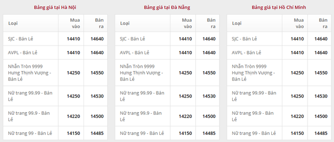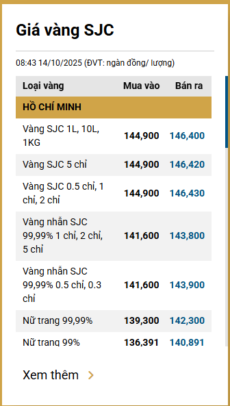 Tại Việt Nam, vào sáng 14/10, Công ty Vàng bạc đá quý Sài Gòn niêm yết giá vàng SJC ở mức 144,90-146,40 triệu đồng/lượng (mua vào-bán ra).