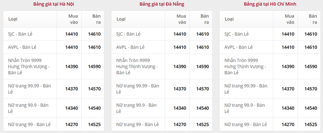 Dưới đây là bảng giá vàng tại một số công ty vàng bạc đá quý trong nước sáng 15/10:
