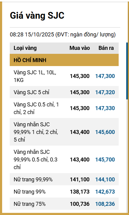 Tại Việt Nam, sáng 15/10, giá vàng SJC tại thị trường Hà Nội được Công ty Vàng bạc đá quý Sài Gòn niêm yết ở mức 145,3-147,3 triệu đồng/lượng (mua vào-bán ra).