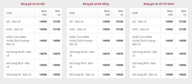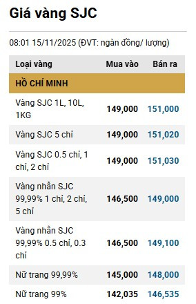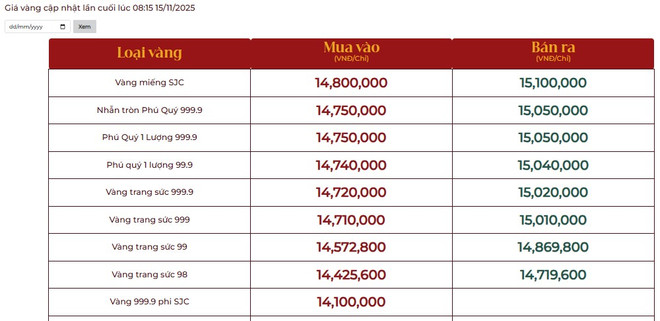 Dưới đây là bảng giá vàng tại một số công ty vàng bạc đá quý trong nước sáng 15/11: