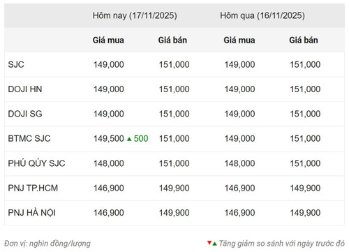 Cụ thể, tại thời điểm 10 giờ 30 phút ngày 17/11, Công ty Vàng bạc đá quý Sài Gòn (SJC) niêm yết giá vàng miếng SJC mua vào-bán ra ở mức 149-151 triệu đồng/lượng, đứng yên so chốt phiên trước đó. Chênh lệch mua-bán 2 triệu đồng/lượng.