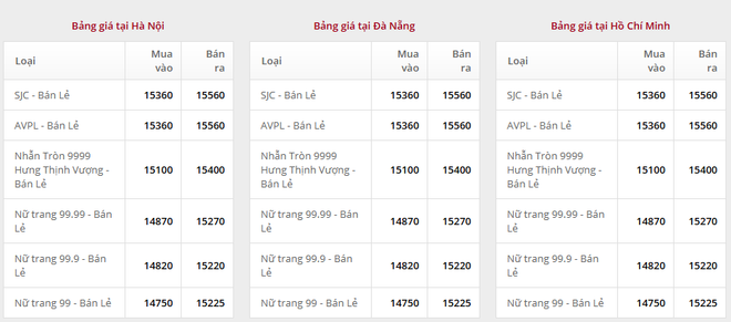 Giá vàng tại Công ty Trách nhiệm hữu hạn Một thành viên Vàng bạc đá quý Sài Gòn (SJC):