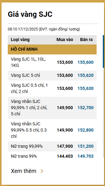 Sáng 17/12, Công ty Vàng bạc đá quý Sài Gòn SJC niêm yết giá vàng miếng ở mức 153,6-155,6 triệu đồng/lượng (mua vào-bán ra).