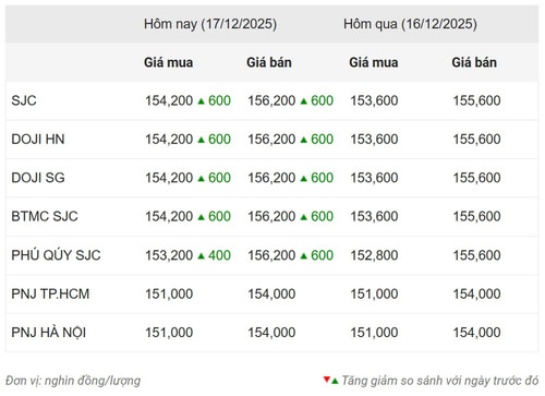 Cụ thể, tại thời điểm 10 giờ 30 phút ngày 17/12, Công ty Vàng bạc đá quý Sài Gòn (SJC) niêm yết giá vàng miếng SJC mua vào-bán ra ở mức 154,2-156,2 triệu đồng/lượng, tăng 600.000 đồng so chốt phiên trước đó. Chênh lệch mua-bán 2 triệu đồng/lượng.