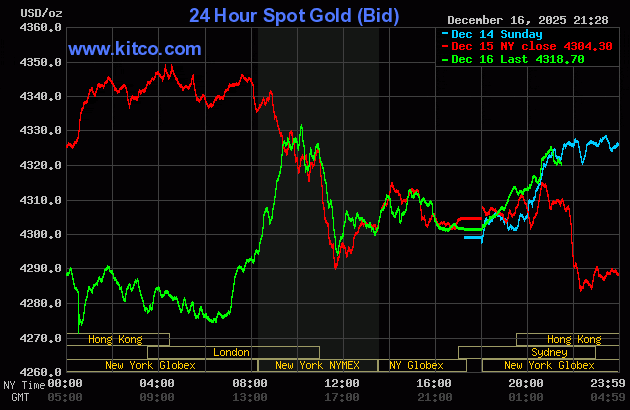 Tính đến 10 giờ sáng 17/12 (giờ Việt Nam), giá vàng thế giới tăng 14,4 USD so chốt phiên trước đó lên mức 4.318,7 USD/ounce.