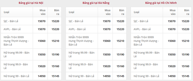 Tại Việt Nam, vào đầu giờ sáng 18/10, Công ty Vàng bạc đá quý Sài Gòn SJC và Tập đoàn DOJI niêm yết giá vàng miếng ở mức 151,5-153,0 triệu đồng/lượng (mua vào-bán ra).