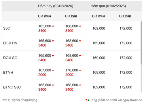 Cụ thể, tại thời điểm 9 giờ sáng 2/2, Công ty Vàng bạc đá quý Sài Gòn (SJC) niêm yết giá vàng miếng SJC mua vào-bán ra ở mức 165,6-168,6 triệu đồng/lượng, giảm 3,4 triệu đồng so kết phiên hôm trước. Chênh lệch mua-bán 3 triệu đồng/lượng.