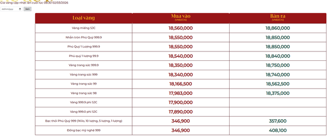 Dưới đây là bảng giá vàng tại một số công ty vàng bạc đá quý trong nước sáng 2/3: