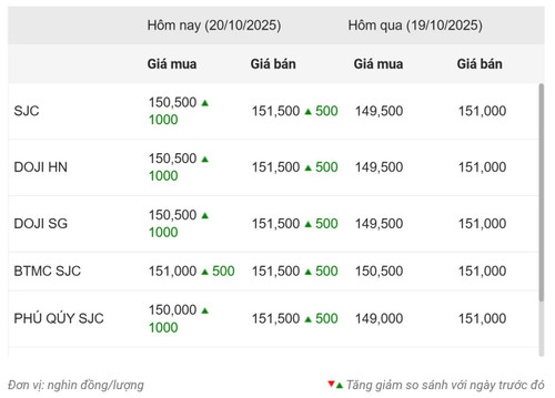Cụ thể, tại thời điểm 12 giờ ngày 20/10, Công ty Vàng bạc đá quý Sài Gòn (SJC) niêm yết giá vàng miếng SJC mua vào-bán ra ở mức 150,5-151,5 triệu đồng/lượng, tăng lần lượt 1 triệu đồng và 500.000 đồng so kết phiên trước đó. Chênh lệch mua-bán 1 triệu đồng/lượng.
