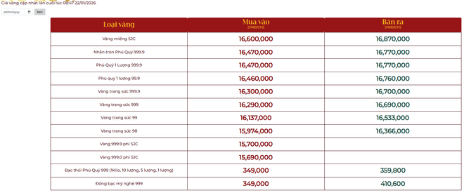 Giá vàng tại Công ty Cổ phần Đầu tư vàng Phú Quý: