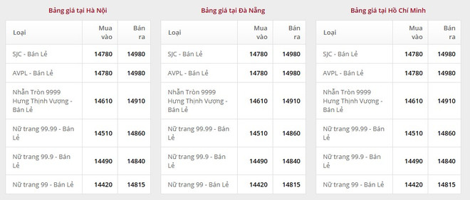 Giá vàng tại Công ty Trách nhiệm hữu hạn Một thành viên Vàng bạc đá quý Sài Gòn (SJC):