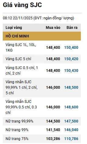 Tại Việt Nam, sáng sớm 22/11, giá vàng SJC tại thị trường Hà Nội được Công ty Vàng bạc đá quý Sài Gòn niêm yết ở mức 147,8-149,8 triệu đồng/lượng (mua vào-bán ra).