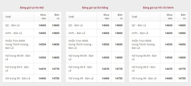 Giá vàng tại Công ty Trách nhiệm hữu hạn Một thành viên Vàng bạc Đá quý Sài Gòn (SJC):
