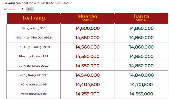 Dưới đây là bảng giá vàng tại một số công ty vàng bạc đá quý trong nước sáng 23/10: