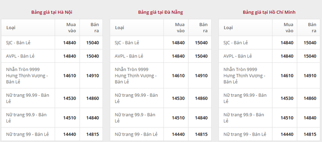 Tại Việt Nam, Công ty Vàng bạc đá quý Sài Gòn SJC niêm yết giá vàng miếng ở mức 148,4 - 150,4 triệu đồng/lượng (mua vào - bán ra).