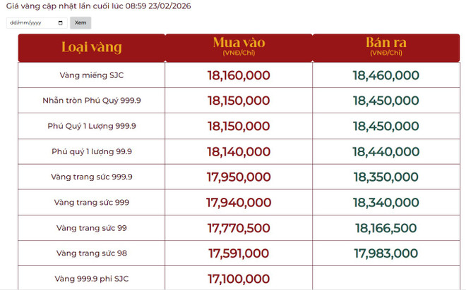 Dưới đây là bảng giá vàng tại một số công ty vàng bạc đá quý trong nước sáng 23/2: