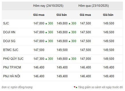 Cụ thể, tại thời điểm 8 giờ 30 phút sáng 24/10, Công ty Vàng bạc đá quý Sài Gòn (SJC) niêm yết giá vàng miếng SJC mua vào-bán ra ở mức 147,8-149,8 triệu đồng/lượng, tăng 300.000 đồng so kết phiên trước đó. Chênh lệch mua-bán 2 triệu đồng/lượng.