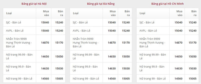 Giá vàng tại Công ty Cổ phần Đầu tư vàng Phú Quý: