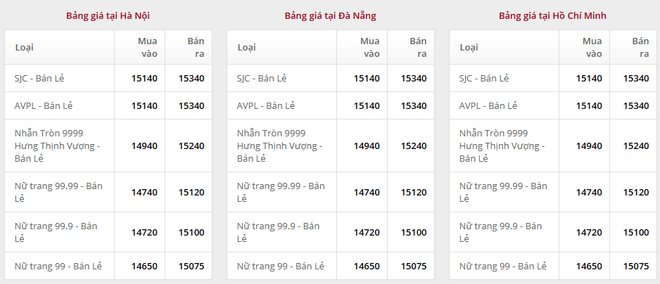 Giá vàng tại Công ty Trách nhiệm hữu hạn Một thành viên Vàng bạc đá quý Sài Gòn (SJC):