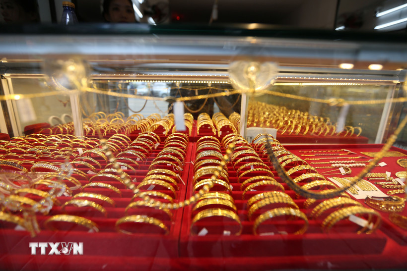 Vàng được bày bán tại cửa hàng kim hoàn ở Yangon, Myanmar. (Ảnh: THX/TTXVN)