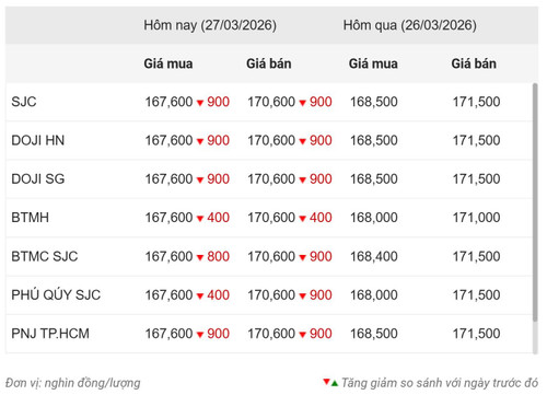 Cụ thể, tại thời điểm 10 giờ 30 phút ngày 27/3, Công ty Vàng bạc đá quý Sài Gòn (SJC) niêm yết giá vàng miếng SJC mua vào-bán ra ở mức 167,6-170,6 triệu đồng/lượng, giảm 900.000 đồng so kết phiên hôm trước. Chênh lệch mua-bán 3 triệu đồng/lượng.