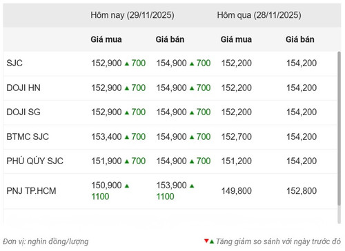 Cụ thể, tại thời điểm 12 giờ 30 phút ngày 29/11, Công ty Vàng bạc đá quý Sài Gòn (SJC) niêm yết giá vàng miếng SJC mua vào-bán ra ở mức 152,9-154,9 triệu đồng/lượng, tăng 700 nghìn đồng mỗi lượng ở cả chiều mua vào và chiều bán ra so chốt phiên hôm trước. Chênh lệch mua-bán ở mức 2 triệu đồng.